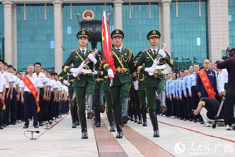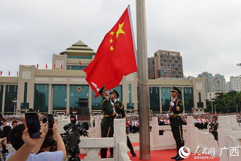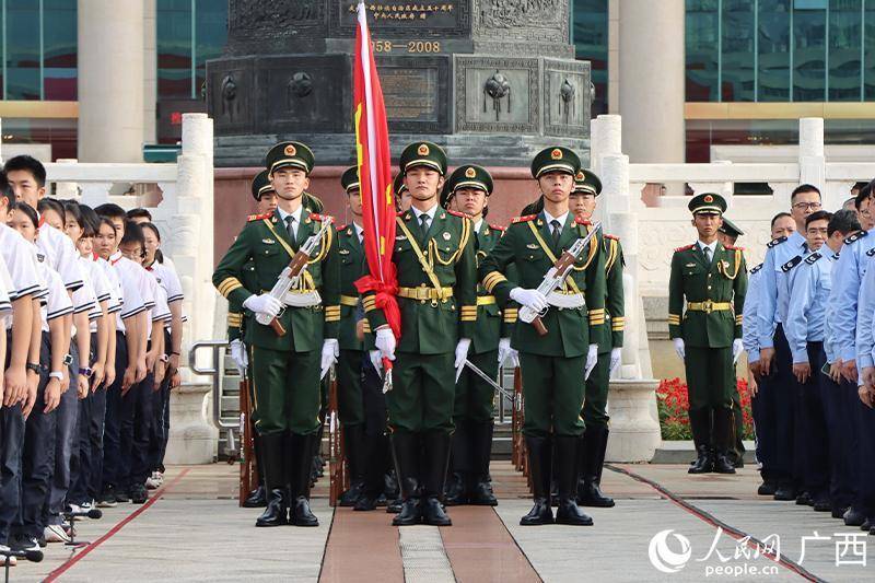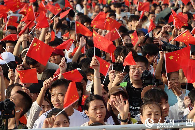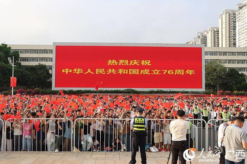 人民网南宁10月1日电(冯肖慧)10月1日,南宁市举行庆祝中华人民共和国成立76周年升国旗仪式。来自四面八方的游客和市民齐聚南宁民族广场,带着满腔热情观看升旗仪式。