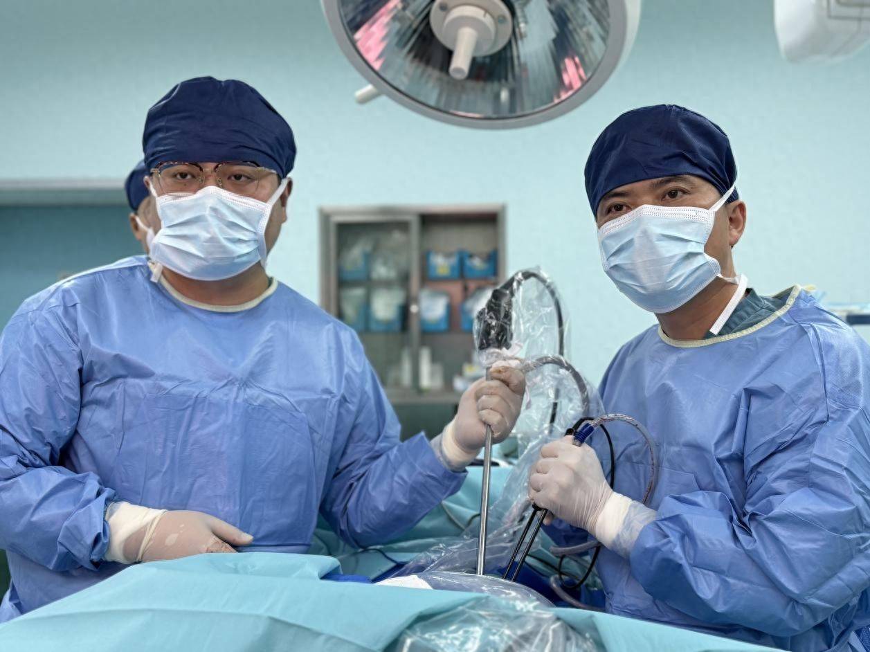 图片说明:刘小玉(右)、申磊(左)正在为患者进行手术